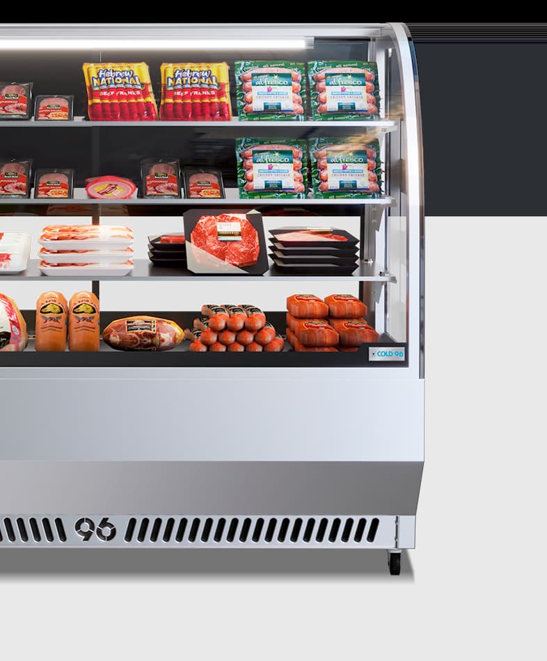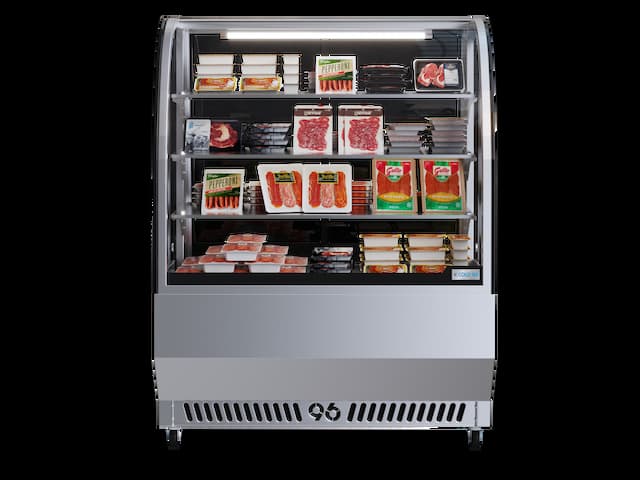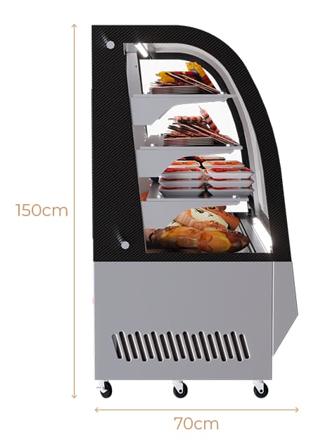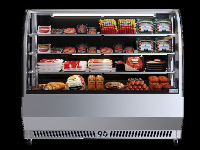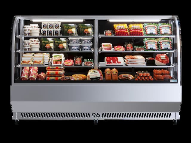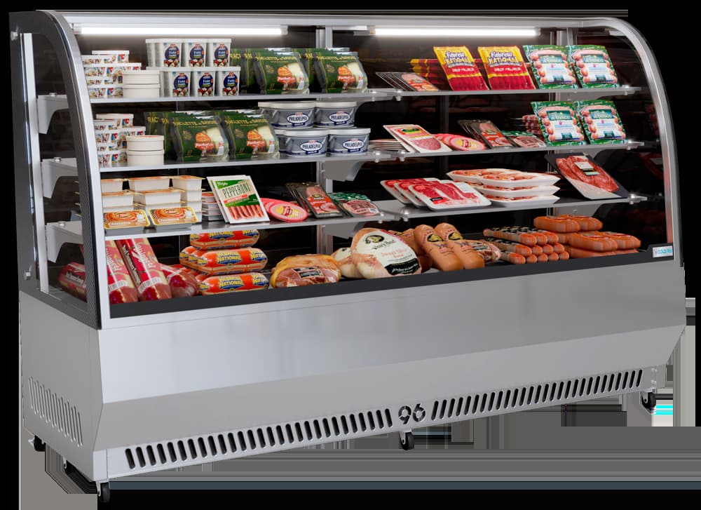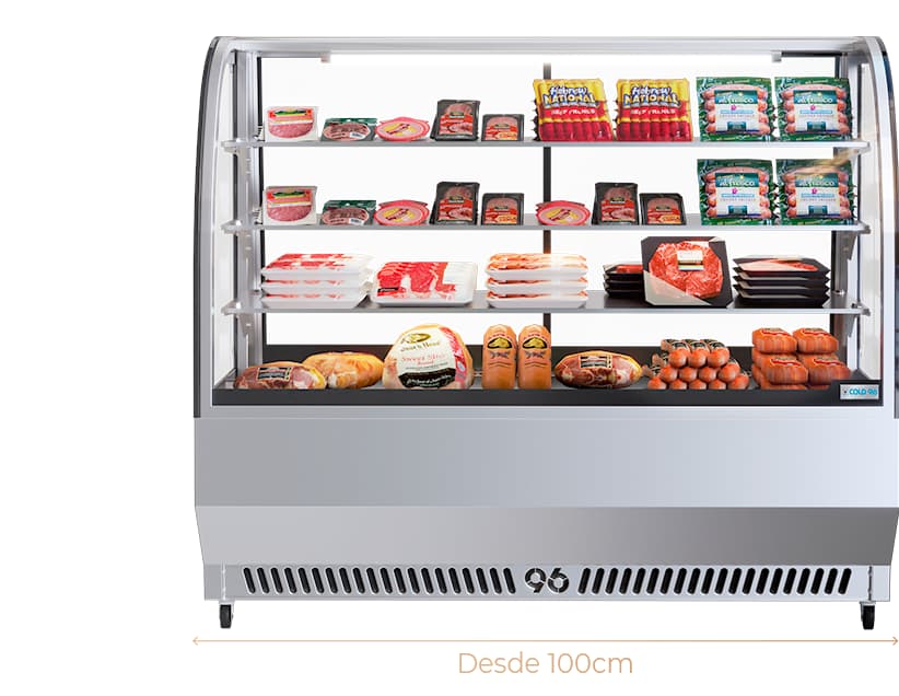 Vitrina de acero inoxidable, especialmente diseñada para la conservación y exhibición de quesos y embutidos. Cuenta con un elegante vidrio curvo que realza la presentación de los productos, mientras su sistema de refrigeración eficiente garantiza que se mantengan siempre frescos.